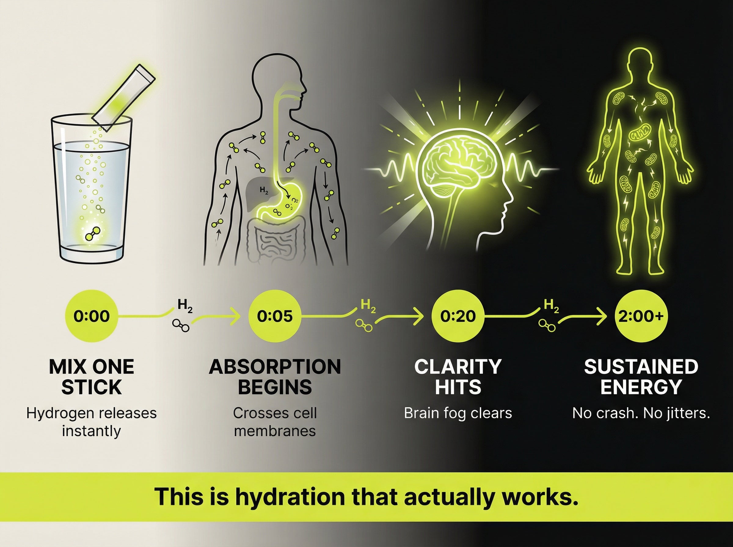 Delivered via elemental magnesium reacting with citric acid. Every stick releases 10–12 ppm hydrogen into water, clinically effective doses shown in 1,000+ studies to reduce oxidative stress, support mitochondrial function, and enhance hydration at the cellular level.
